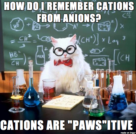 This is one way for me to learn about chemistry. CAT-ion is a positively, or PAW-sitively charged ion.
